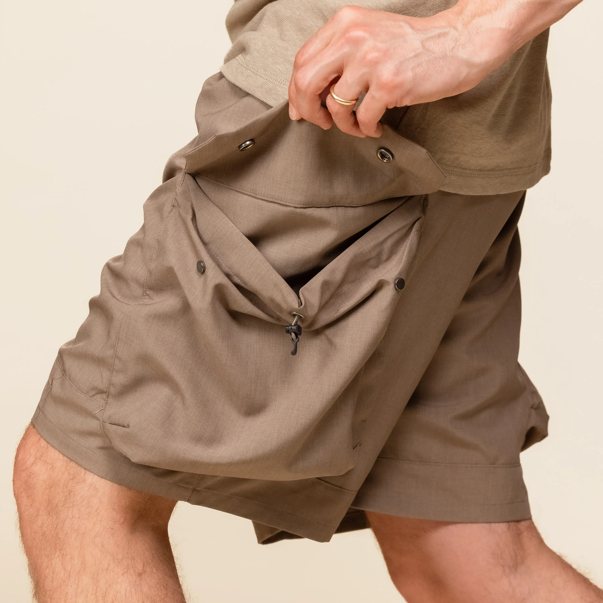 Why carry around a bag when you can wear cargo shorts? The Luggage Cargo Shorts from meanswhile feature a two tuck design which allows the volume of the front pleat to balance out the volume of the cargo pockets. Draw cord adjustable side pockets and adjustable side waist webbing belts. The fabric is a linen like fabric with a natural feel and a dry touch. Somewhat formal in look it can be dressed up or down with ease.